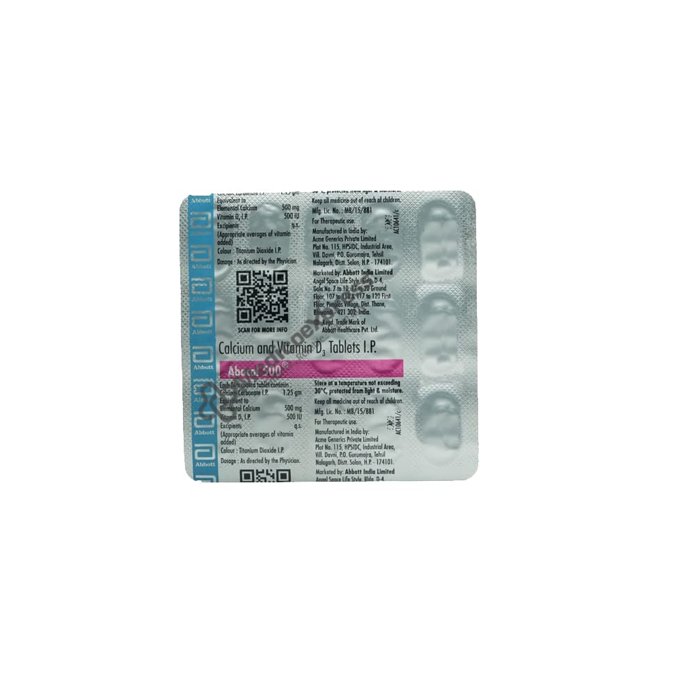 Abocal 500 Tablet 15's is a 'nutritional supplement' that is primarily used to treat low blood calcium levels. It effectively treats conditions caused by low calcium levels in the body, such as Vitamin D deficiency, osteoporosis (weak and brittle bones), hypoparathyroidism (parathyroid glands produce low calcium levels in the body), latent tetany (a muscle disease caused by low blood calcium levels), and rickets or osteomalacia (softening or deforming of bones due to lack of calcium).Disclaimer:For More Information Contact Your Physician