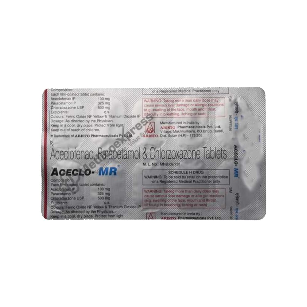 ACECLO MR TABLET consists of the drugs Aceclofenac, Chlorzoxazone, and Paracetamol, which are all members of the analgesic and muscle relaxant drug classes, respectively. Muscular pain and spasms are treated with it. Back pain and joint pain, including those caused by osteoarthritis and rheumatoid arthritis, can both be relieved by it (Ex. ankylosing spondylitis).Disclaimer : For More Details, Contact Your Physician