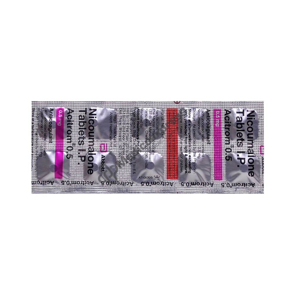 Acitrom 0.5 mg Tablet 10's works to stop dangerous blood clots from forming in the legs, lungs, brain, and heart. Deep vein thrombosis, pulmonary embolism, and stroke prophylaxis are all treated with it. As directed by the physician, take one Acitrom 0.5 mg Tablet 10's daily. Although you can take it either way, it's best to take it at a set time. Without first seeing a doctor, do not abruptly discontinue taking this medication. Even if you feel fine, you should take this medication frequently to reap the best benefits. It is averting potential harm. Your risk of bleeding may rise if you use this medication. If you notice a little rash or notice blood in your stool, urine, or vomit, call your doctor right away.Disclaimer:For more information contact your physician.