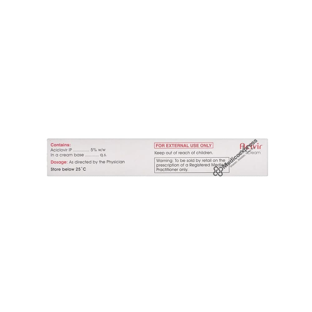 Acivir Cream is an antiviral cream used to treat skin infections caused by the Herpes simplex virus, such as herpes labialis. It prevents the virus from multiplying in skin cells and thus aids in the healing of the skin infection.Disclaimer:For More Information Contact Your Physician