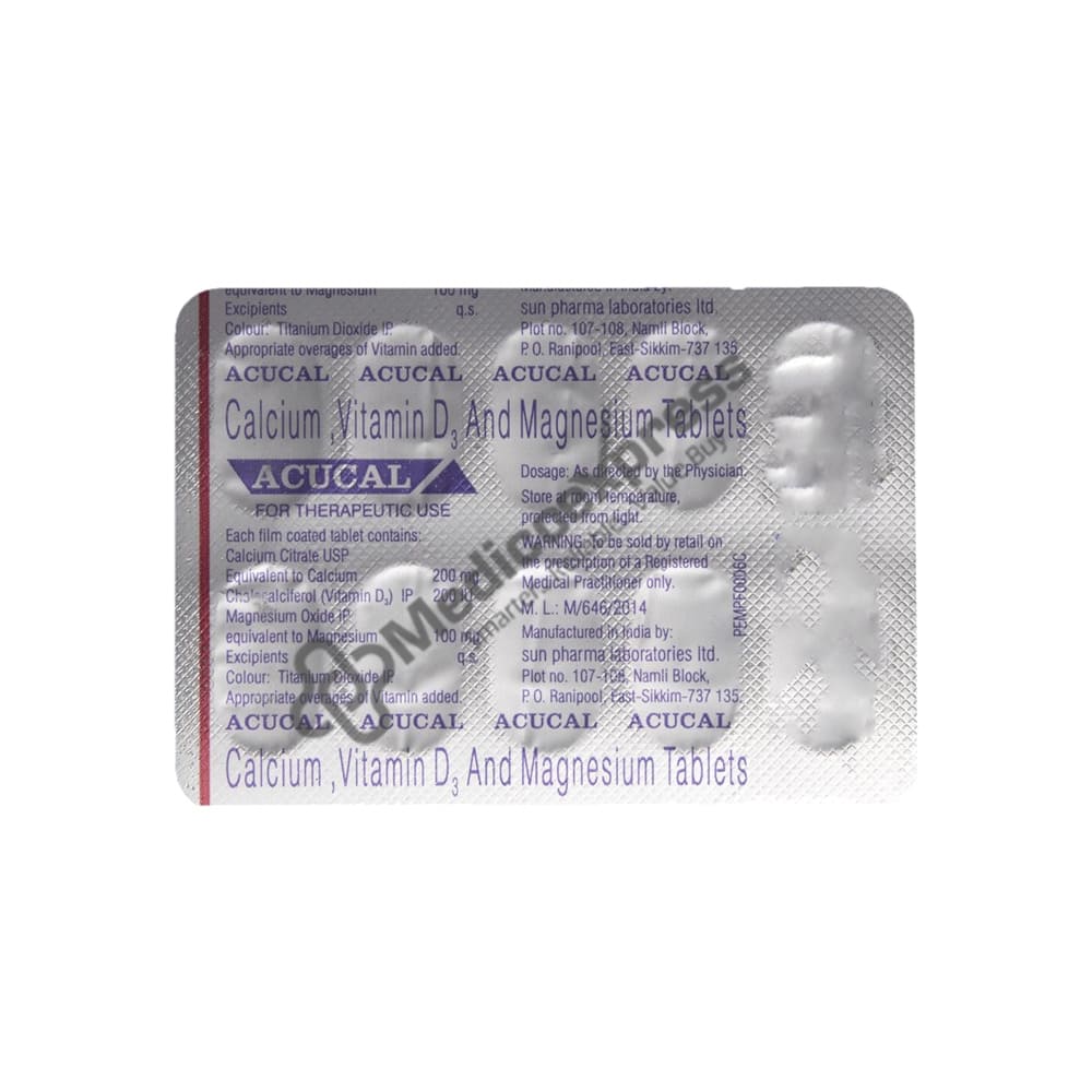 Acucal Tablet contains calcium, vitamin D, and magnesium. Acucal Tablets are used to treat calcium and vitamin deficiency, pregnancy and lactation, rickets, postmenopausal symptoms, and chronic renal failure.Disclaimer:For More Information Contact Your Physician