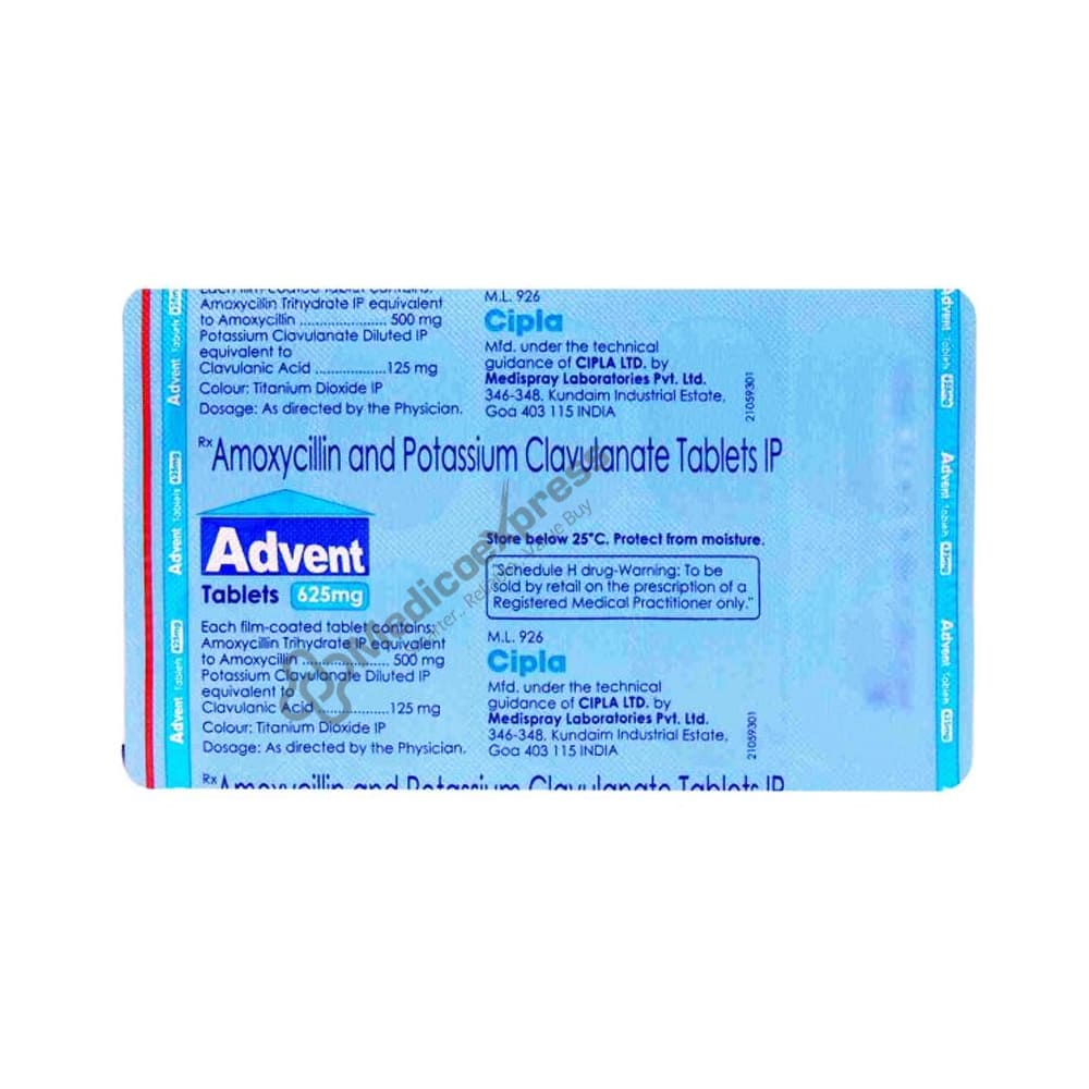 ADVENT is a combination of Amoxicillin and Clavulanic acid that belongs to the Antibiotics class of drugs. It is approved for the treatment of a variety of infections, including respiratory tract infections (Ex. adequately diagnosed community acquired pneumonia, chronic bronchitis), middle ear and sinus infections (Ex. acute otitis media, acute bacterial sinusitis), urinary tract infections (Ex. pyelonephritis or cystitis), skin and soft tissue infections (Ex. cellulitis, animal bites, dental infection), and bone and joint infections (Ex. osteomyelitis) (weighing not less than 45 kg).Disclaimer:For More Information Contact Your Physician