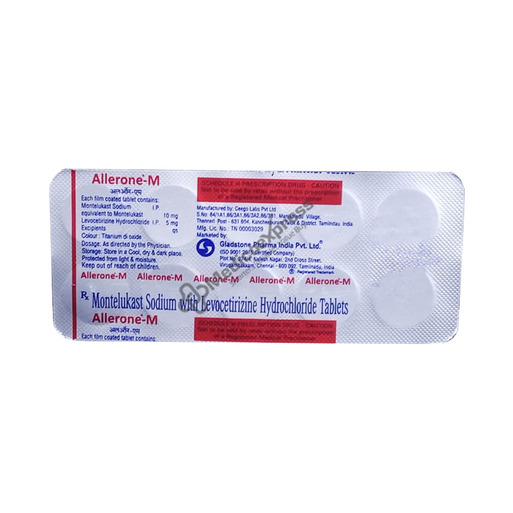 Allerone M Tablet 10s Is a Mixture Of Anti-Allergic Treatments That Includes Two Medications: Levocetirizine And Montelukast + Which Are Primarily Used To Treat Allergic Symptoms. Levocetirizine Inhibits The Effects Of a Chemical Messenger Known As 'Histamine + ' Which Is Naturally Implicated In Allergic Reactions.Disclaimer:For More Information Contact Your Physician