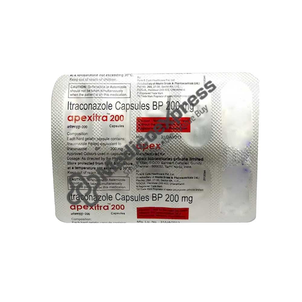 Apexitra 200 Capsule belongs to a class of drugs known as antifungals. It treats infections of the mouth, throat, vagina, and other parts of the body, including fingernails and toenails, by inhibiting fungi growth. Fungi are killed by destroying the fungal cell membrane.Disclaimer:For More Information Contact Your Physician