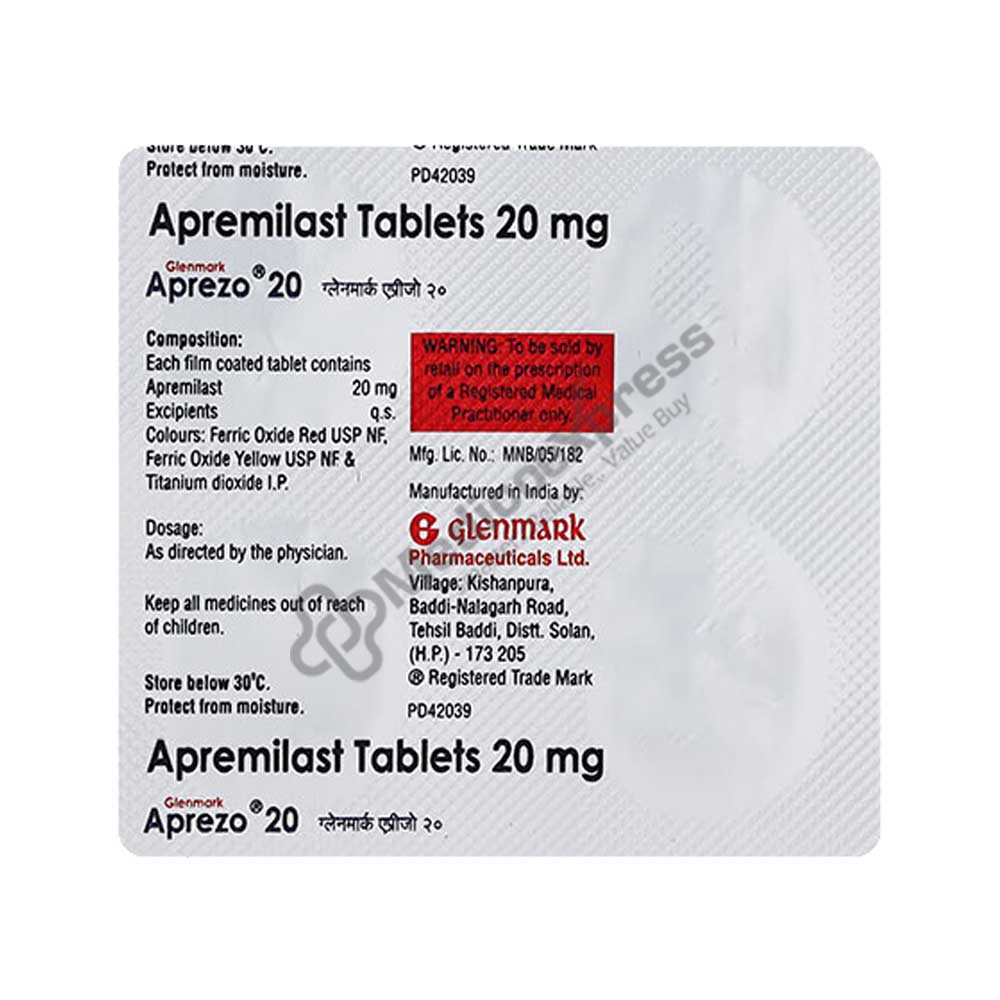 Aprezo 20 Tablet 4's is a member of the class of medications known as phosphodiesterase 4 (PDE4) inhibitors. It is used to treat oral ulcers, psoriasis arthritis, plaque psoriasis, which manifests as scaly, itchy, and red patches on the skin, and psoriatic arthritis, which causes inflammation in the joints. A debilitating, painful, non-transmissible, chronic condition, psoriasis can cause damage to the body. It is most common in people between the ages of 50 and 69, though it can occur at any age. Some people who have psoriasis also have psoriatic arthritis, which is a type of arthritis.Disclaimer : For More Details, Contact Your Physician