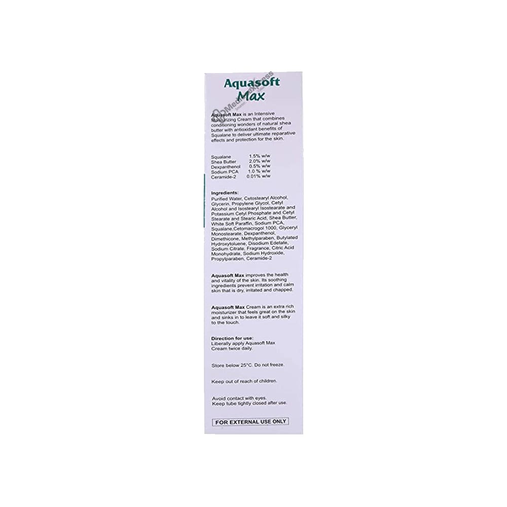 Aquasoft Max 150 gm Cream contains the conditioning advantages of natural shea butter and the antioxidant advantages of squalene. As a result, it aids in skin protection and restoration. Ceramides stop the skin from losing water. As a result, the skin becomes supple and velvety. Skin is made softer by dexpanthenol by creating an oily layer on top of the skin. It makes the skin healthier and more vibrant. Dry, chapped, and irritated skin is soothed and protected from irritation. A very thick moisturiser, it feels wonderful on the skin and absorbs quickly, leaving the skin feeling silky and smooth to the touch. The skin is moisturised for 24 hours. All types of skin can use it.Disclaimer:For more information contact your physician.
