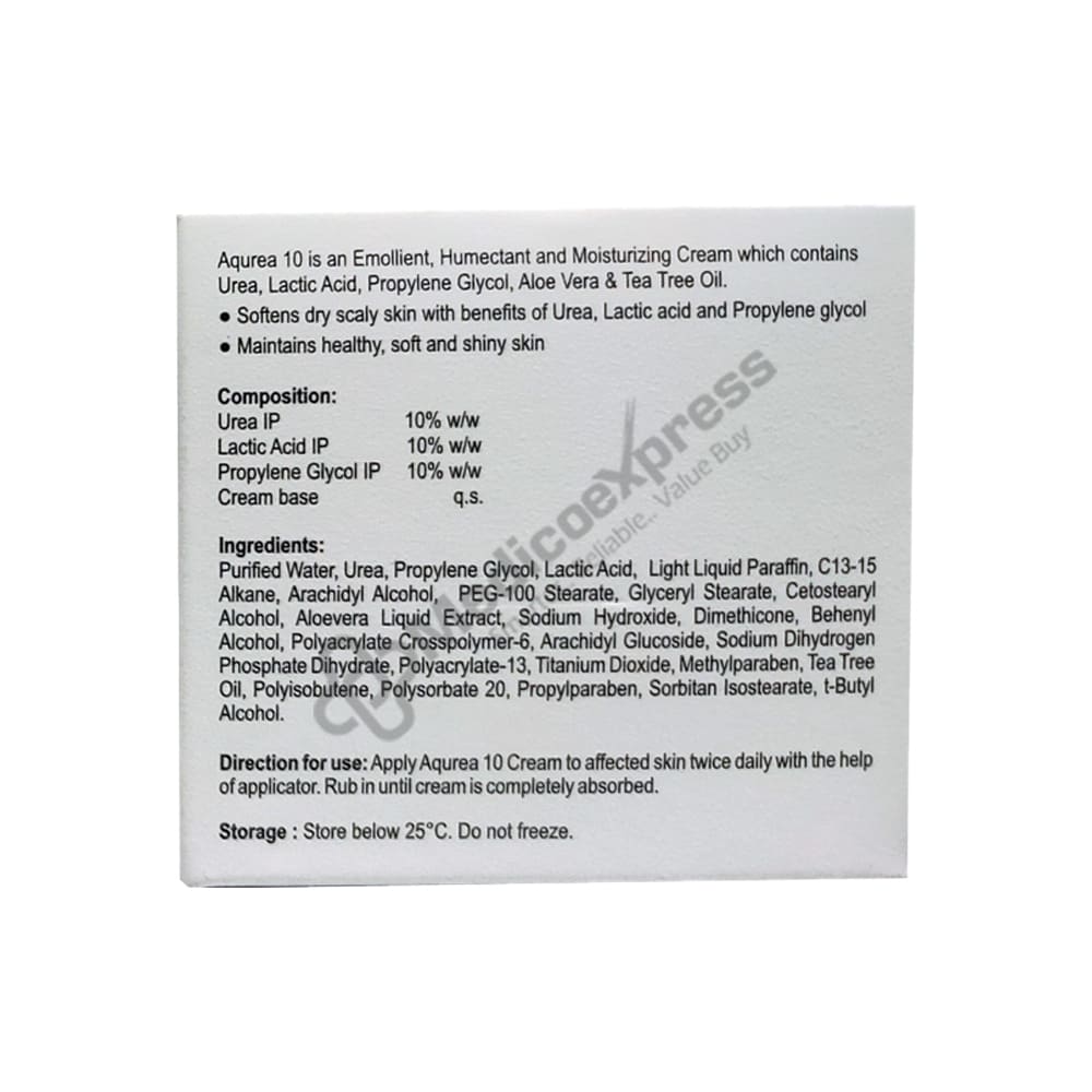 Aqurea 10 Moisturizing Urea Cream was created with the goodness of urea, lactic acid, aloe vera, and tea tree oil to nourish the skin. It softens and shines the skin. It should be used on a daily basis for best results.Disclaimer:For More Information Contact Your Physician
