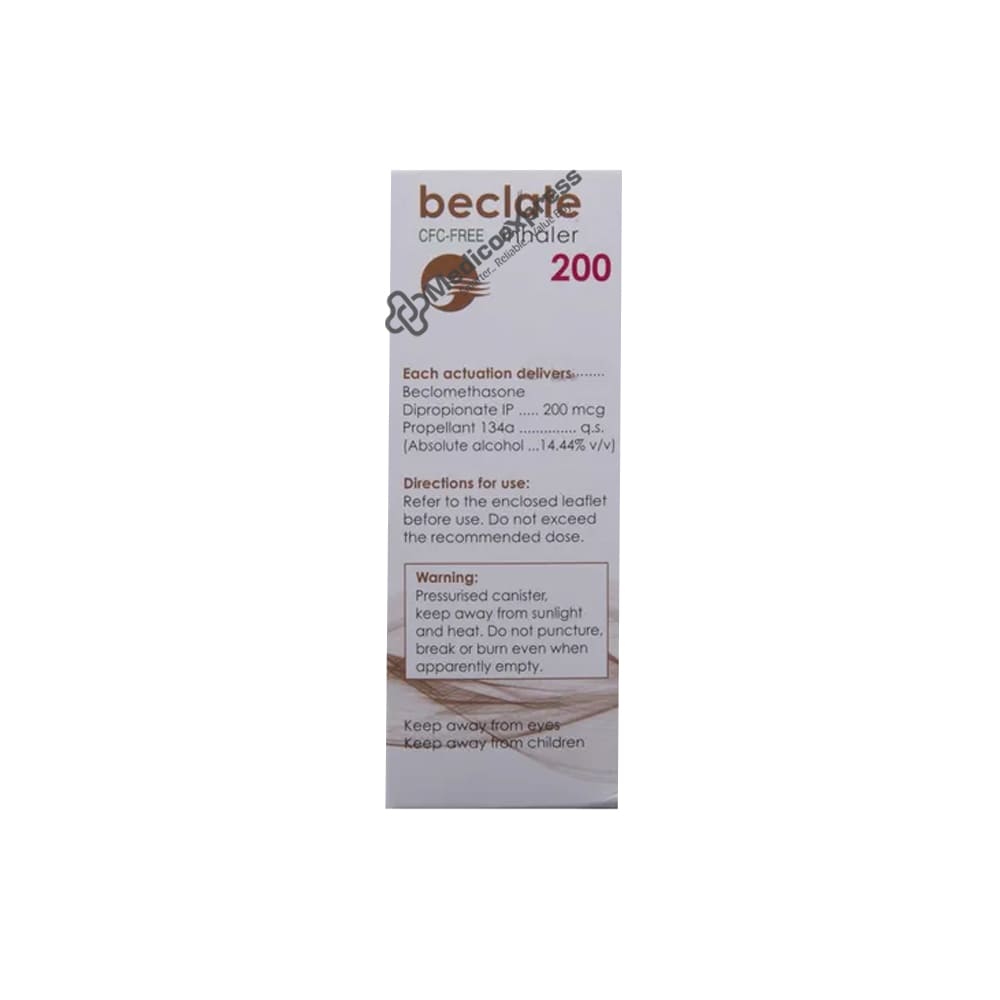 Beclate 200 CFC Free Inhaler is a type of medication known as a steroid. It is used to both prevent and treat asthma. When inhaled, it reduces inflammation in the lungs and airway passages, allowing for easier breathing.Disclaimer:For More Information Contact Your Physician