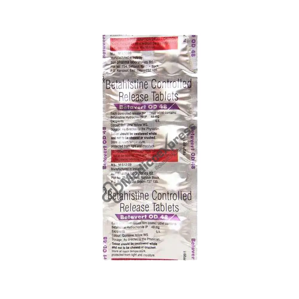 Betavert OD 48 Tablet 10's is an antihistamine anti-vertigo medication that is primarily used to treat Meniere's disease and its symptoms such as dizziness (vertigo), ringing in the ears (tinnitus), feeling sick (nausea), and difficulty hearing.Disclaimer:For More Information Contact Your Physician