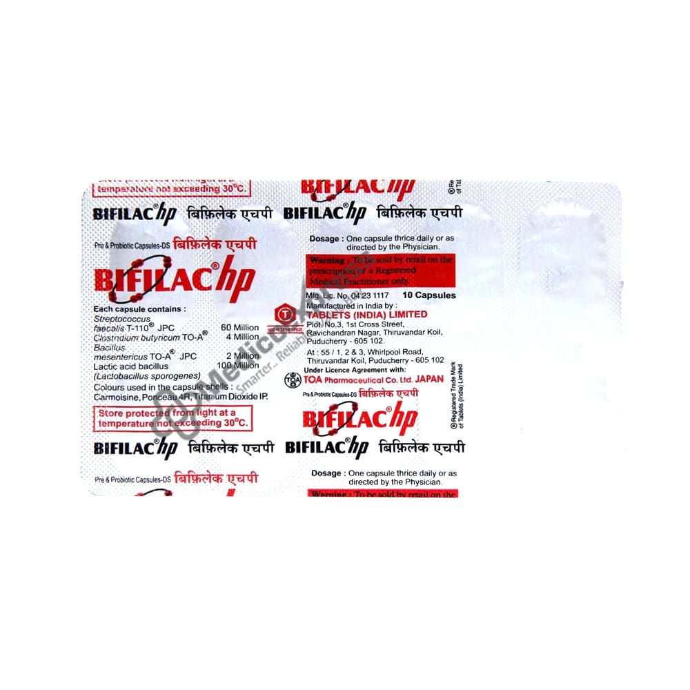 Bifilac hp capsule includes four distinct strains of beneficial bacteria with prebiotic and probiotic characteristics.Disclaimer:For more information contact your physician