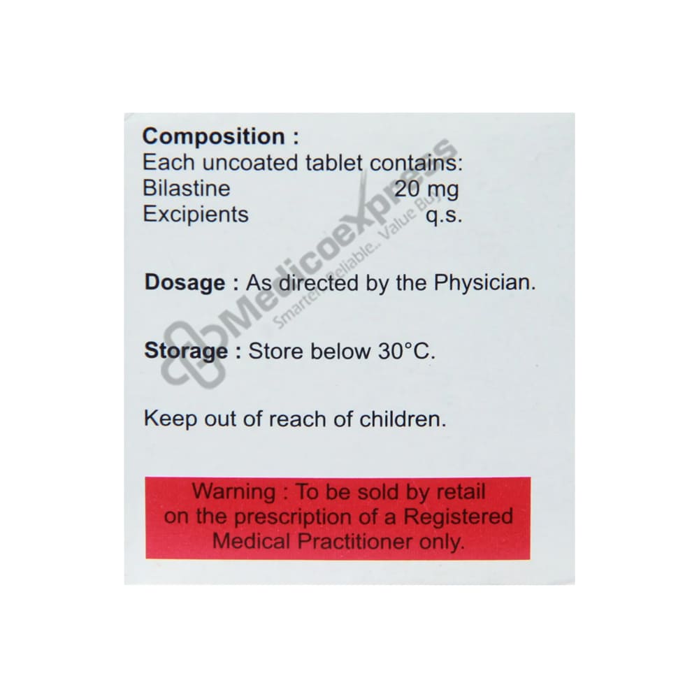 Bilanix Tablet 10 contains an 'anti-histamine/anti-allergic' medication, which is primarily used to treat allergic symptoms such as a blocked/runny/itchy nose, red/watery eyes, and skin rashes.Disclaimer:For More Information Contact Your Physician