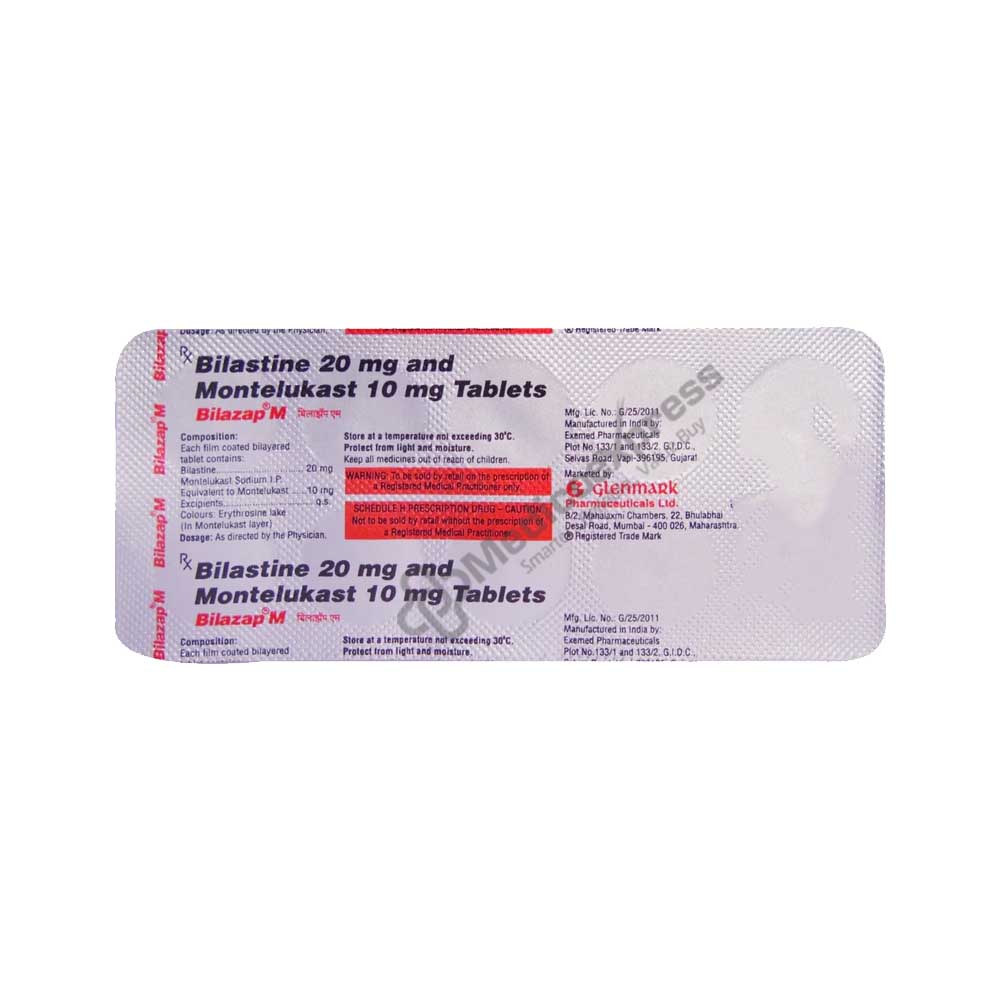 Bilazap M Tablet 10's are primarily used to treat allergy disorders like sneezing, runny nose, congestion, stuffy nose, or watery eyes. When the immune system reacts to a foreign chemical that is generally not damaging to your body, an allergy is a disorder that develops. These alien materials are referred to as "allergens." Certain foods and seasonal allergens like hay fever, pollen, or pet dander may cause allergies in some people. When mucus or a foreign irritant enters the respiratory system, the cough reflex occurs in the throat, which is one of the primary symptoms of allergy. Leukotriene receptor antagonist Montelukast and bilastine are two medications that are combined in Bilazap M Tablets 10's (antihistamine). The leukotriene receptor antagonists class includes montelukast.Disclaimer : For More Details, Contact Your Physician