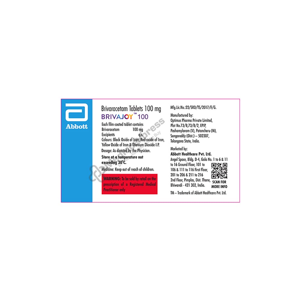 Brivajoy 100 Tablet 14 is an anti-convulsant medication that is primarily used in the prevention of partial-onset seizures in people with epilepsy (fits). Epilepsy is characterised by a surge of electricity in the brain. The brain's electrical rhythms become imbalanced in epilepsy, resulting in recurrent seizures.Disclaimer:For More Information Contact Your Physician