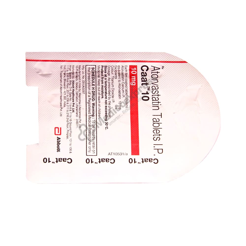 Caat 10 mg Tablet 15s are part of a group of drugs known as statins that are used to treat high cholesterol levels in the body. Low-density lipoprotein (LDL), or bad cholesterol, is reduced and high-density lipoprotein (HDL), or good cholesterol, is elevated in the blood as a result of taking Caat 10 mg Tablet 15s. The buildup of harmful lipid (fat) levels in the blood is known as dyslipidaemia. Low-density lipoprotein (LDL or bad cholesterol), triglycerides, and high-density lipoprotein (HDL) levels are always high in this syndrome (HDL or good cholesterol). Atorvastatin is an ingredient in Caat 10 mg Tablet 15s that works by reducing the amount of cholesterol that could build up on the walls of the arteries and prevent blood flow.Disclaimer:For more information contact your physician.