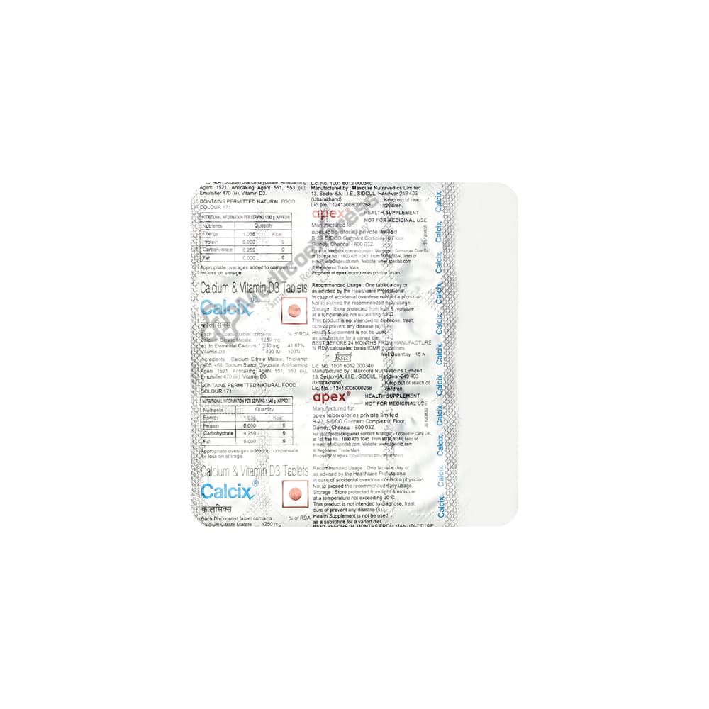Calcix Tablet 15's is used to treat calcium and vitamin D insufficiency. It aids in keeping strong bones and teeth and is used to treat disorders like osteoporosis.Before beginning to take Calcix Tablet, tell your doctor if you are pregnant, planning a pregnancy, or nursing. Also tell them about all the medications and supplements you take, as well as any disorders or illnesses you have. If you use steroids, medications used to treat cardiac conditions, medications used to treat thyroid disorders, or any other medications or dietary supplements, talk to your doctor.Disclaimer:For more information contact your physician.