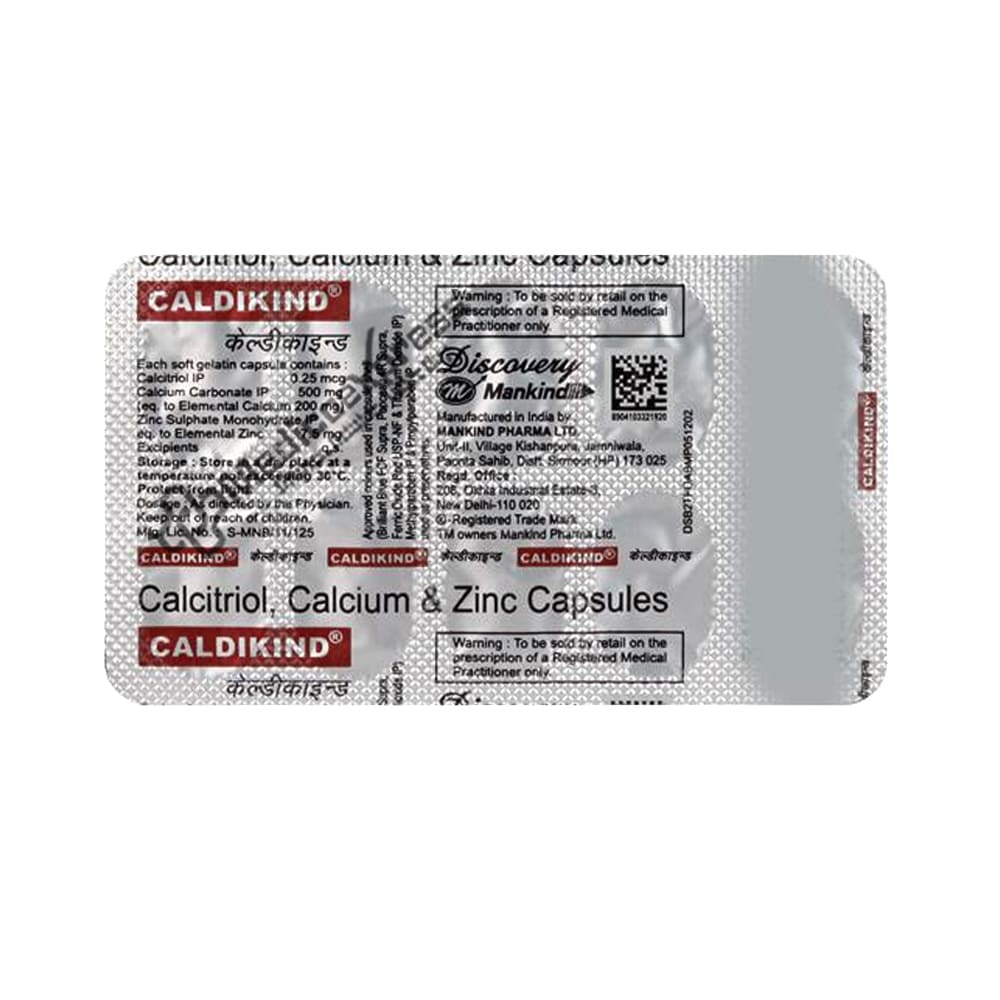 Caldikind Capsule 10'S contains Calcitriol. It is the active form of vitamin D3 (cholecalciferol). Both the functioning of calcium in the body and its absorption from the stomach are dependent on vitamin D. For neurons, cells, muscles, and bones to function normally, calcium carbonate is necessary. Bone loss is halted by calcium. Zinc is a dietary vitamin essential for healthy growth and tissue repair. Supplemental zinc not only enhances calcitriol response but also slows bone loss in older postmenopausal women.Disclaimer:For more information contact your physician.
