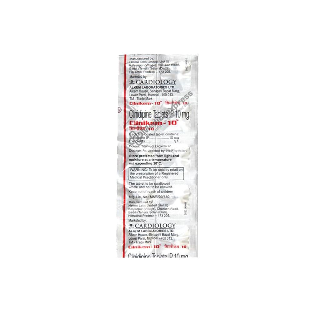 Cilnikem 10mg Tablet 10'S, is a member of the class of drugs known as antihypertensive medications. It is utilised to treat vascular diseases brought on by hypertension as well. Hypertension, commonly referred to as high blood pressure, is a medical disorder where the amount of force that the blood exerts against the artery walls remains very high. As a result, it can seriously harm the blood vessels that supply the heart, kidneys, and brain. It could result in significant problems like a heart attack, heart failure, stroke, or even blindness if left untreated. Cilnikem 10mg Tablet 10'S lowers blood pressure, which lowers the risk of angina (chest discomfort), heart attack (myocardial infarction), and stroke (sudden loss of blood supply).Disclaimer:For more information contact your physician.
