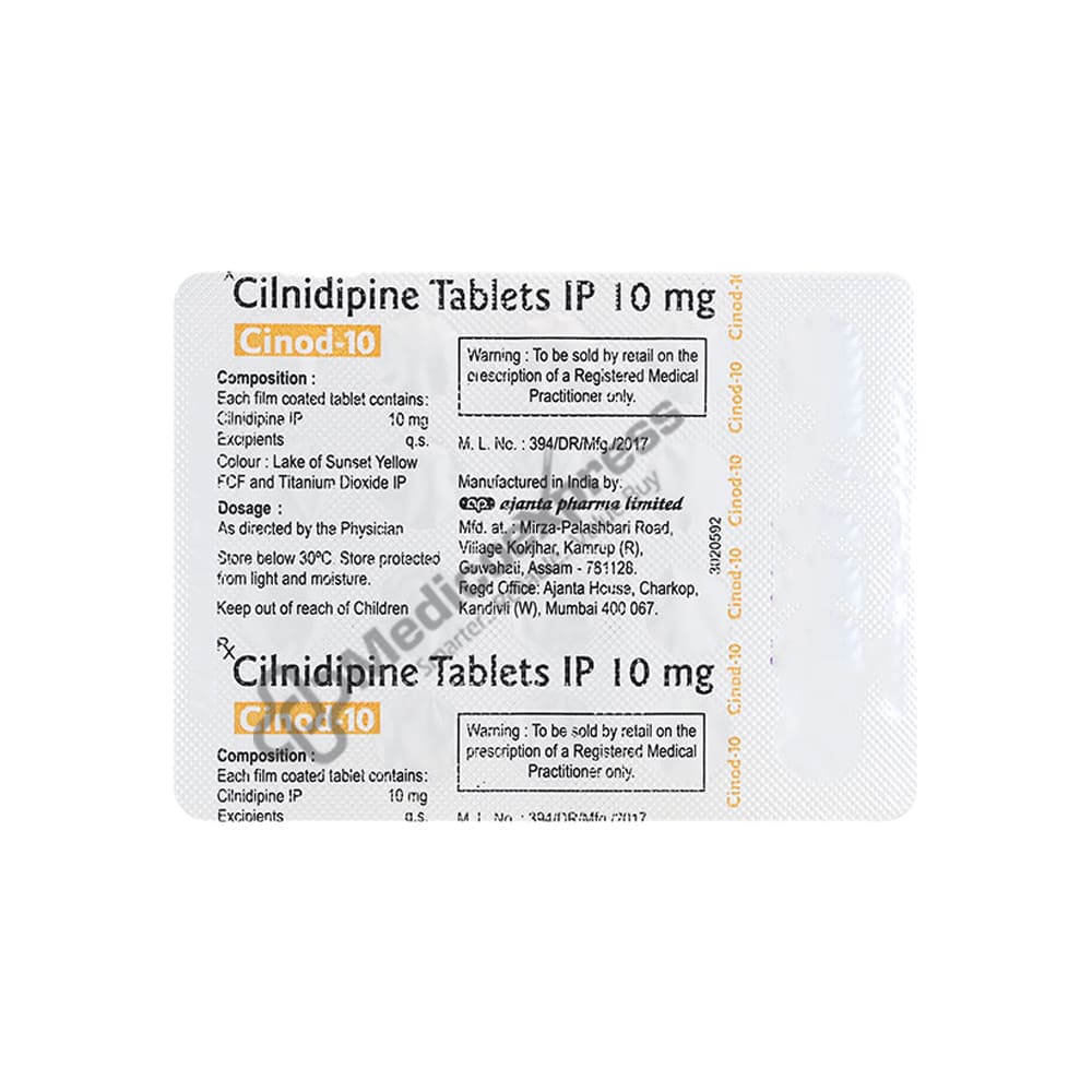 Cinod-10 Tablet 20 contains Cilnidipine, a calcium channel blocker that works by relaxing blood vessels. This reduces the workload on the heart and makes it more efficient at pumping blood throughout the body. As a result, it helps to lower high blood pressure, lowering the risk of a heart attack or stroke.Disclaimer:For More Information Contact Your Physician