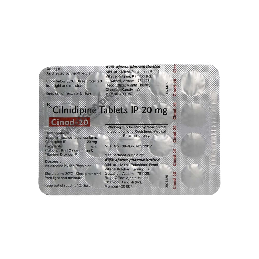 Cinod-20 Tablet 20's belongs to a class of medications known as calcium channel blockers, which are primarily used to treat hypertension (high blood pressure) and angina. Hypertension (high blood pressure) is a lifelong or chronic condition in which the force exerted by the blood against the artery walls becomes excessive. The higher the blood pressure, the harder the heart has to work to pump.Disclaimer:For More Information Contact Your Physician