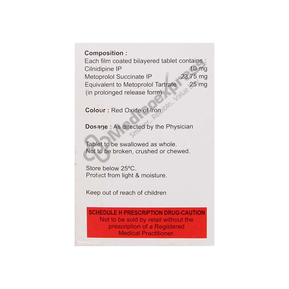Cinod Beta 10/25 mg Tablet 15's is a mixture of antihypertensive medications used to treat high blood pressure. When a single drug fails to control blood pressure, Cinod Beta 10/25 Tablet 15's are administered. Beyond this Additionally shields the heart from a potential heart attack by reducing blood pressure. High blood pressure, often known as hypertension, is a chronic force of the blood against the arteries that can cause a number of cardiac disorders. The workload on the heart and arteries is increased by high blood pressure. Metoprolol and cilnidipine are both found in Cinod Beta 10/25 Tablet 15s. The function of some natural compounds in your body is blocked by metoprolol, which is essential in relaxing your blood vessels. It facilitates heart rate reduction, making pumping simpler.Disclaimer:For more information contact your physician.