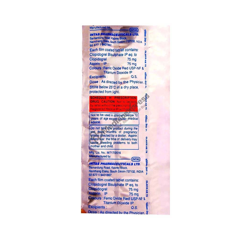 Clavix-As 75 Tablet 15's Include An Anti-Platelet Medication (Blood Thinner) That Is Primarily Used To Prevent Heart Attacks And Strokes In Those Who Are At High Risk Of Heart Disease.Disclaimer:For More Information Contact Your Physician