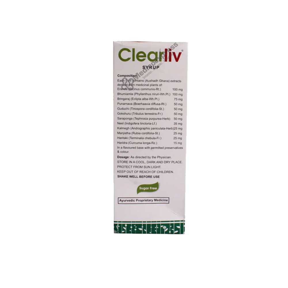 Clearliv Syrup is an ayurvedic medication that aids in the treatment of acute and chronic inflammatory liver illnesses brought on by bacteria, viruses, and toxins. Additionally, it is used to treat a variety of illnesses including cancer, diabetes, liver disease, loss of appetite, hepatic disease, jaundice, stomach problems, irregular stools, liver diseases, constipation, and others. Disclaimer:For more information contact your physician.