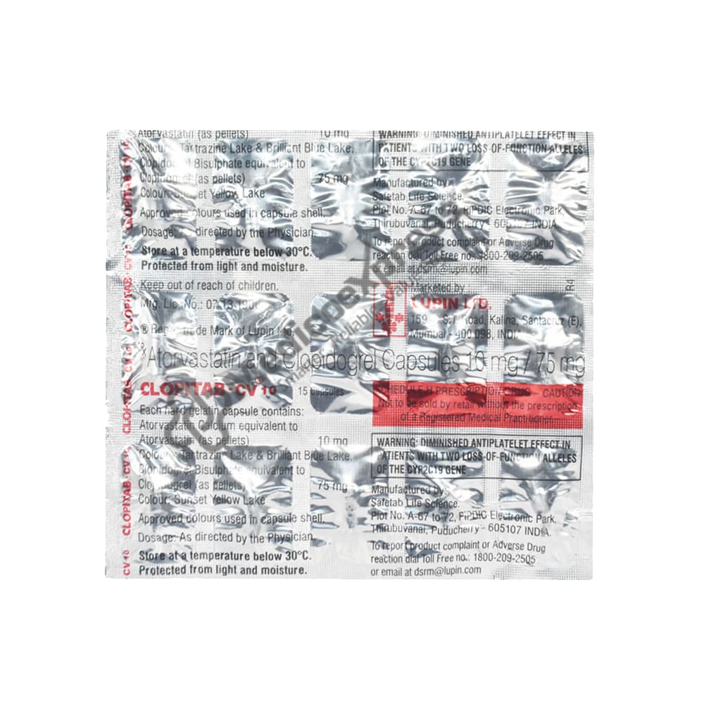 Clopitab CV 10 mg Tablet 15's is an anti-platelet medication (blood thinner) used to treat persons at high risk for heart disease and to prevent heart attacks and strokes. In general, a heart attack refers to a stopped blood flow to the heart caused by blocked arteries. Most frequently, a heart blockage is caused by the accumulation of fat, cholesterol, and other chemicals in the form of plaque in the arteries that supply the heart (coronary arteries). An antiplatelet drug or blood thinner is a class of medication that includes clopitab CV 10 mg Tablet 15's. In order to keep dangerous blood clots (plaque) from forming in your veins, Clopitab CV 10 mg Tablet 15's are essential. It facilitates simple vein-to-vein blood flow.Disclaimer:For more information contact your physician.