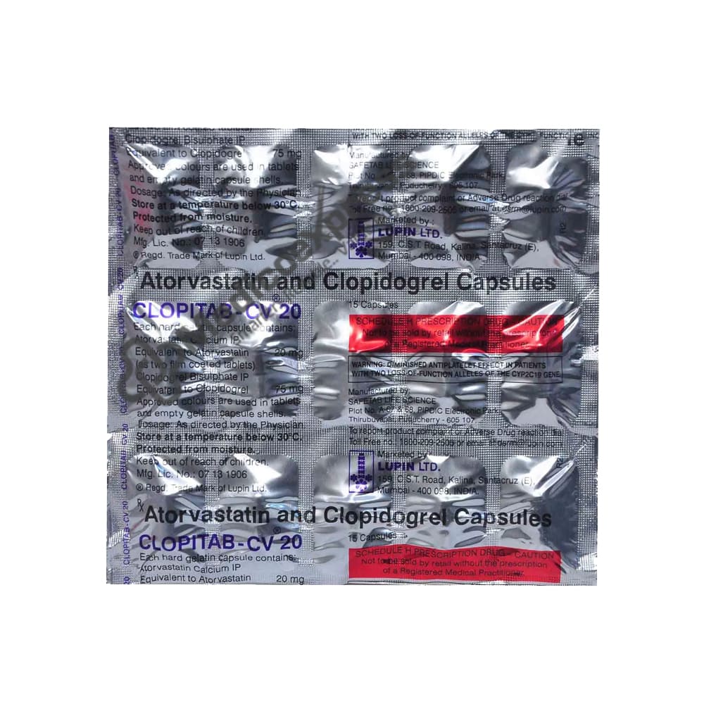 Clopitab CV 20 mg Tablet 15's is an anti-platelet medication (blood thinner) used to treat persons at high risk for heart disease and to prevent heart attacks and strokes. In general, a heart attack refers to a stopped blood flow to the heart caused by blocked arteries. Most frequently, a heart blockage is caused by the accumulation of fat, cholesterol, and other chemicals in the form of plaque in the arteries that supply the heart (coronary arteries). An antiplatelet drug or blood thinner is a class of medication that includes clopitab CV 20 mg Tablet 15's. In order to keep dangerous blood clots (plaque) from forming in your veins, Clopitab CV 20 mg Tablet 15's are essential. It facilitates simple vein-to-vein blood flow.Disclaimer:For more information contact your physician.