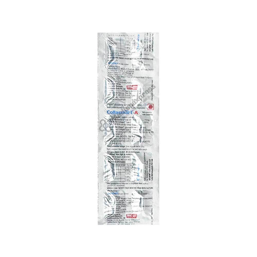Collasmart A capsule 10's is used to treat osteoarthritis and other joint conditions. Osteoarthritis is a progressive kind of arthritis that is defined by the degeneration of joint cartilage. The analgesic Collasmart A is efficient and prevents cartilage deterioration. It supports the general health of the joints by offering a comprehensive protein supplement for the cartilage and joints.Aflapin (extracted from Boswellia serrata) and native type II collagen are its active components. A protein called native collagen type II makes up the cartilage, bones, and other tissues in both animals and people. According to theory, it functions by encouraging the body to create chemicals that combat swelling and discomfort. In the body, a chemical known as leukotrienes has been linked to a variety of diseases.Disclaimer:For more information contact your physician.