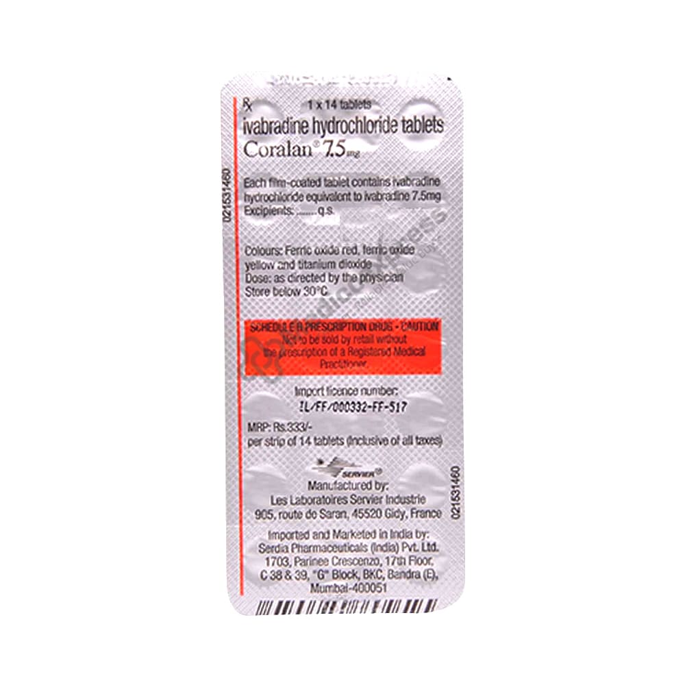 Coralan 7.5mg Tablet Is a Medication That Belongs To The Class Of Hyperpolarization Activated Cyclic Nucleotide Gated Hcn Channel Blockers And Is Primarily Used To Treat Symptomatic Stable Angina Pectoris And Chronic Heart Failure.Disclaimer:For More Information Contact Your Physician