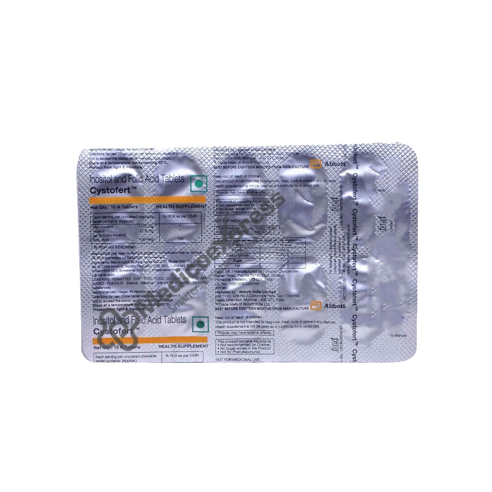 Cystofert Tablet 10 is a dietary supplement used to treat polycystic ovary syndrome. Polycystic ovary/ovarian syndrome is a hormonal disorder that causes enlarged ovaries with numerous small follicles. Symptoms include irregular periods, excessive hair growth, acne, and obesity.Disclaimer:For More Information Contact Your Physician
