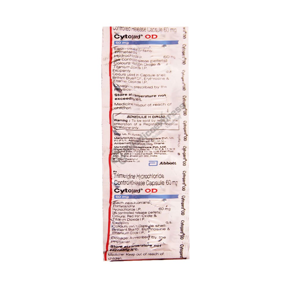 Cytogard Od 60 Capsule 10's Is a Heart-Related Medication That Contains Trimetazidine (Anti-Anginal Drug), Which Is Used In Adult Patients In Combination With Other Medications To Avoid An Attack Of Angina Pectoris (Chest Pain Caused By Coronary Disease).Disclaimer:For More Information Contact Your Physician