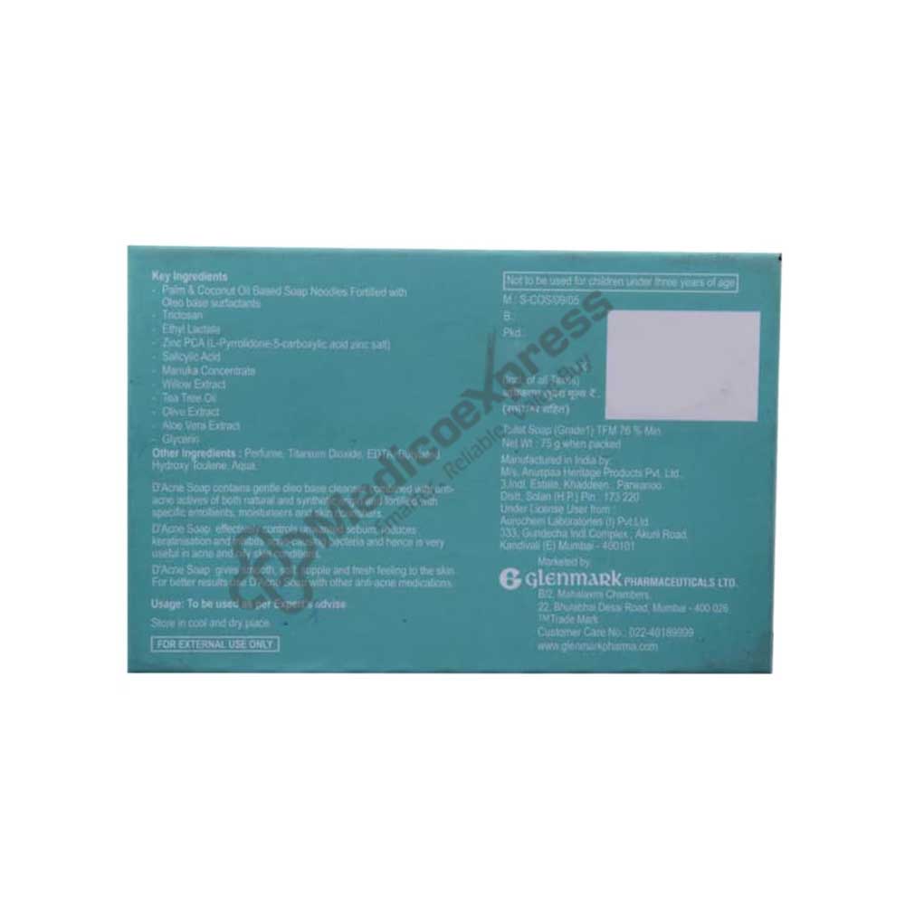 D Acne Soap, 75 gm contains emollients, moisturisers, and nourishers. It is a useful soap for treating acne by protecting against bacteria that cause acne, reducing keratinization, reducing undesirable sebum, and giving you smooth, soft, and supple skin. It fights off the microorganisms that cause acne. It reduces extra sebum and provides soft, smooth skin.Disclaimer:For more information contact your physician.