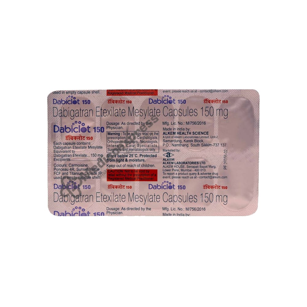 Dabiclot 150mg Capsule 10'S, is a member of the class of drugs known as anticoagulants. It is used to reduce vascular mortality in adult patients with atrial fibrillation, prevent stroke, avoid systemic embolism, and prevent venous thromboembolic events in individuals who have had orthopaedic surgery. Additionally, it inhibits recurring deep vein thrombosis (DVT) and/or pulmonary embolism (PE) and is used to treat acute deep vein thrombosis and/or PE (PE). Children can also use this medication to treat blood clots and stop them from happening again. Avoid taking Dabiclot 110mg Capsule 10'S if you have any bleeding problems at the moment, organ disease that raises your risk of significant bleeding, such as a stomach ulcer, a brain injury or bleeding, severely impaired renal functions..Disclaimer:For more information contact your physician.