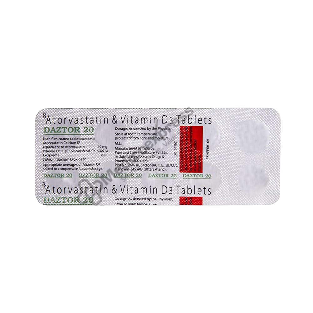 Daztor 20 Tablet 10's is a cholesterol-lowering medication that contains the active ingredients atorvastatin (statins or lipid reducers) and cholecalciferol (Vitamin D3). It aids in the reduction of bad cholesterol (low-density lipoprotein-LDL) and triglyceride (fat) levels. As a result, it lowers the risk of future heart attacks and strokes.Disclaimer:For More Information Contact Your Physician