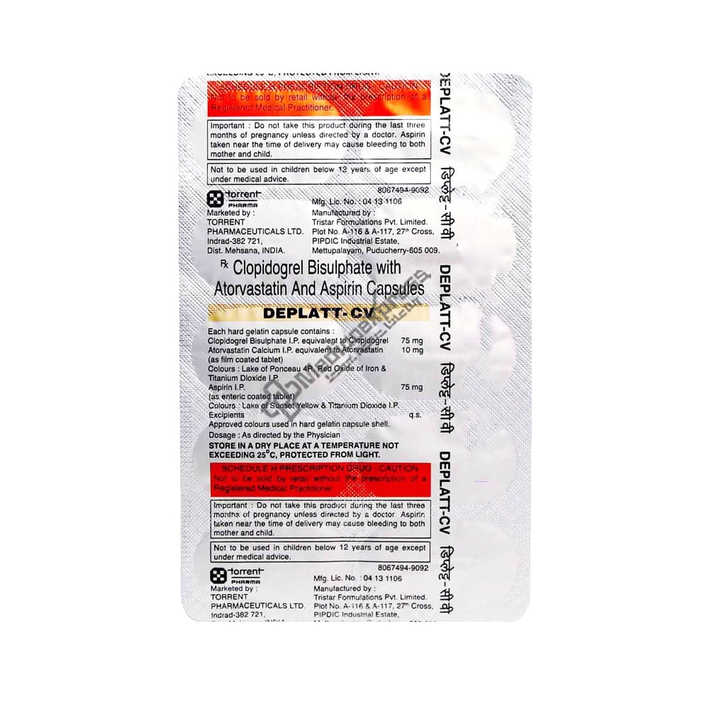 Deplatt-CV Capsule 10's is a medication that combines blood-thinning and cholesterol-lowering medicines and is used to prevent heart attacks and strokes.Disclaimer:For More Information Contact Your Physician