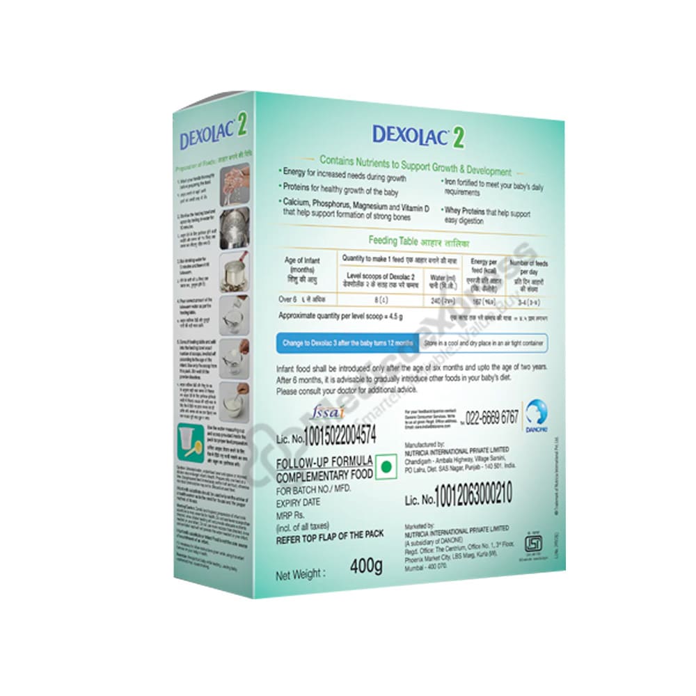 Dexolac 2 follow-up formula refill pack 400gm is a powdered milk substitute for infants over the age of six months. It is rich in nutrients that promote overall growth and development.Disclaimer:For more information contact your physician