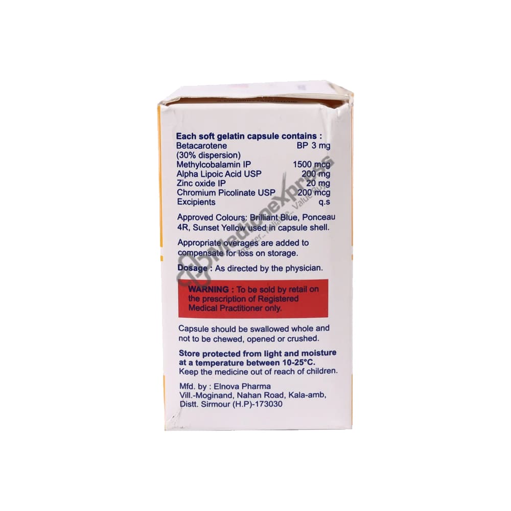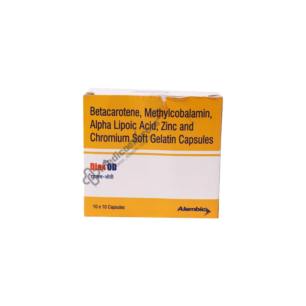 Diax OD Capsule is an antioxidant supplement that contains alpha lipoic acid, beta carotene, chromium, zinc, and methylcobalamin. In diabetics, methylcobalamin normalises protein transport in nerve cells. It has an inhibitory effect on nerve degeneration in drug-induced neuropathies. Through its involvement in the transmethylation reaction, methylcobalamin accelerates the metabolic pathways of nucleic acids, proteins, and lipids, and thus has a repairing effect on injured nerve tissues. Chromium and zinc play important roles in carbohydrate and fat metabolism, and deficiencies result in glucose intolerance and neuropathy.Disclaimer:For More Information Contact Your Physician