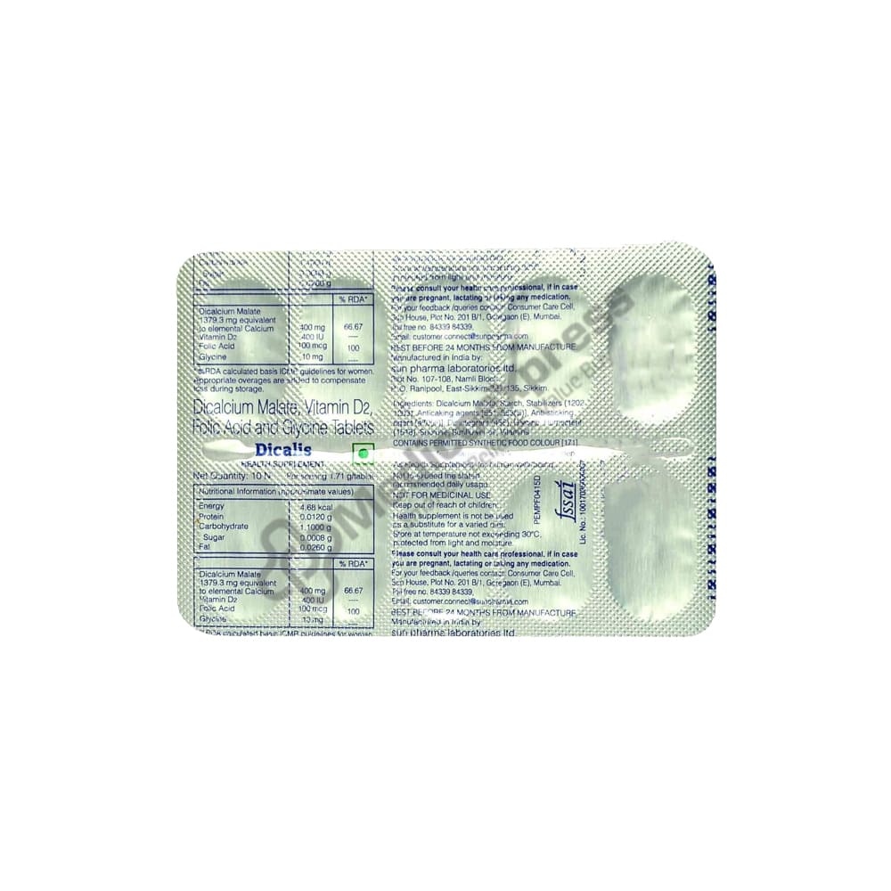Dicalis Tablet is a vitamin and mineral supplement that aids in the normal functioning of the body. It strengthens the bones, promotes the production of healthy RBCs, and aids in muscle recovery. It promotes overall body health.Disclaimer:For More Information Contact Your Physician