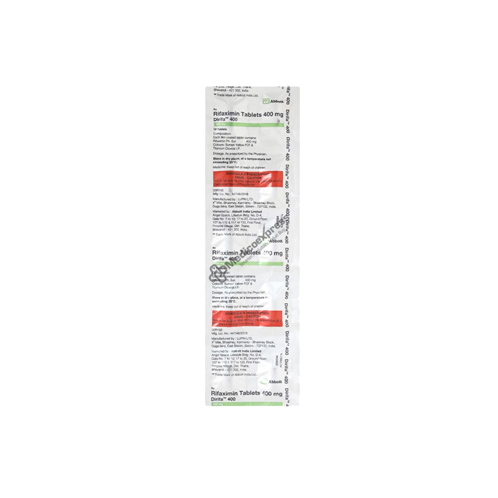 Dirifa 400 Tablet 10's are antibiotics or antibacterials that are used to treat infectious traveller's diarrhoea (in adults and children over the age of 12) caused by E.coli bacteria, hepatic encephalopathy (decreased brain function caused by liver disease), and irritable bowel syndrome with diarrhoea (IBS-D).Disclaimer:For More Information Contact Your Physician
