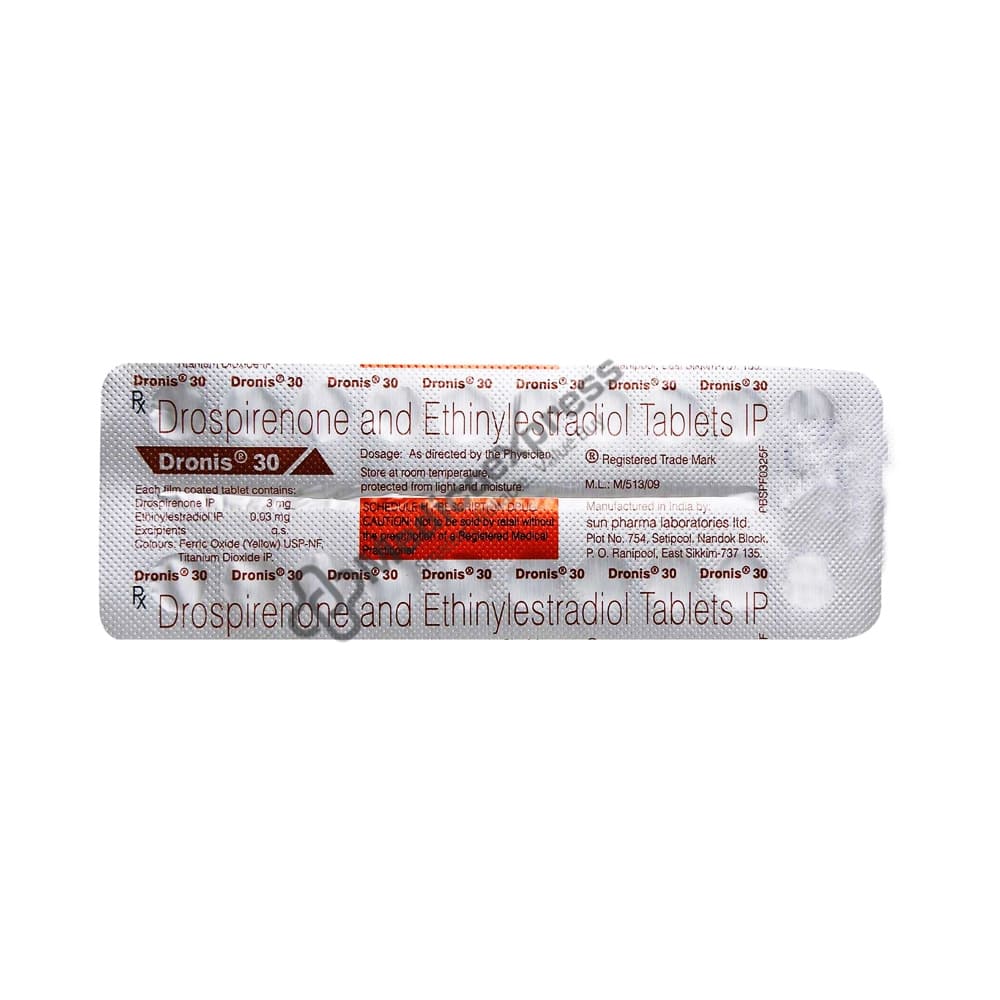 Dronis 30 Tablet 21 is a type of hormonal contraceptive. It is used to prevent pregnancy and to treat premenstrual dysphoria (a mood disorder related to the menstrual cycle). It is also used to treat acne in women over the age of 14 who have begun their first menstrual period.Disclaimer:For More Information Contact Your Physician