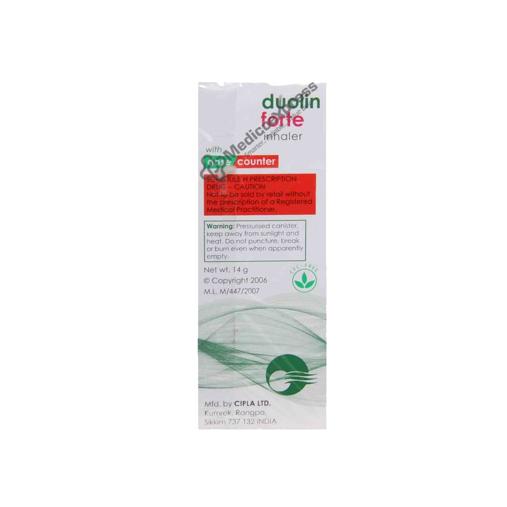 Duolin Forte Inhaler is used to treat chronic obstructive pulmonary disease (a lung disorder in which the flow of air to the lungs is blocked). It aids in relaxing the muscles of the airways and making breathing easier. It relieves coughing, wheezing, and shortness of breath.Disclaimer:For More Information Contact Your Physician