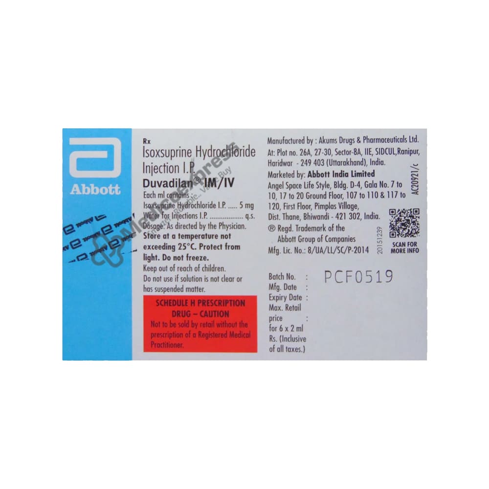 Duvadilan injection is used to increase blood flow in the blood vessels in the treatment of peripheral vascular disease. It contains the vasodilator isoxsuprine. Duvadilan improves blood flow in the hands, feet, and brain by widening blood vessels.Disclaimer:For More Information Contact Your Physician