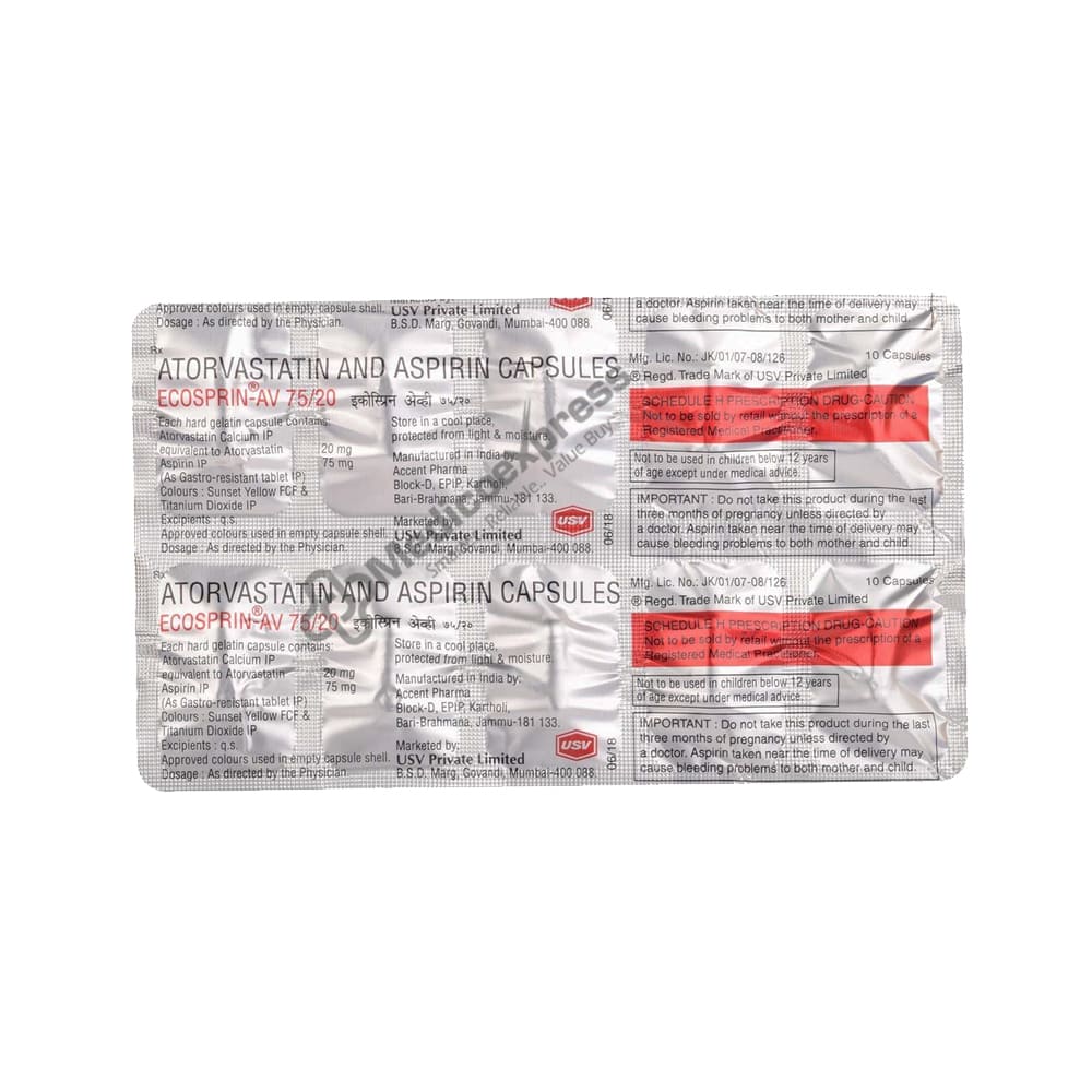 Ecosprin AV 75mg/20mg Capsule 10's is a combination drug of blood-thinning agents and cholesterol-lowering agents, primarily taken for the prevention of heart attack and stroke.Disclaimer:For More Information Contact Your Physician