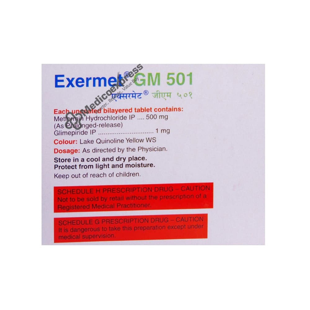 Exermet GM 501 Tablet 15 belongs to a class of drugs known as anti-diabetic drugs, which are used to treat type 2 diabetes, particularly in patients whose blood sugar levels are not controlled by diet and exercise alone.Disclaimer:For More Information Contact Your Physician