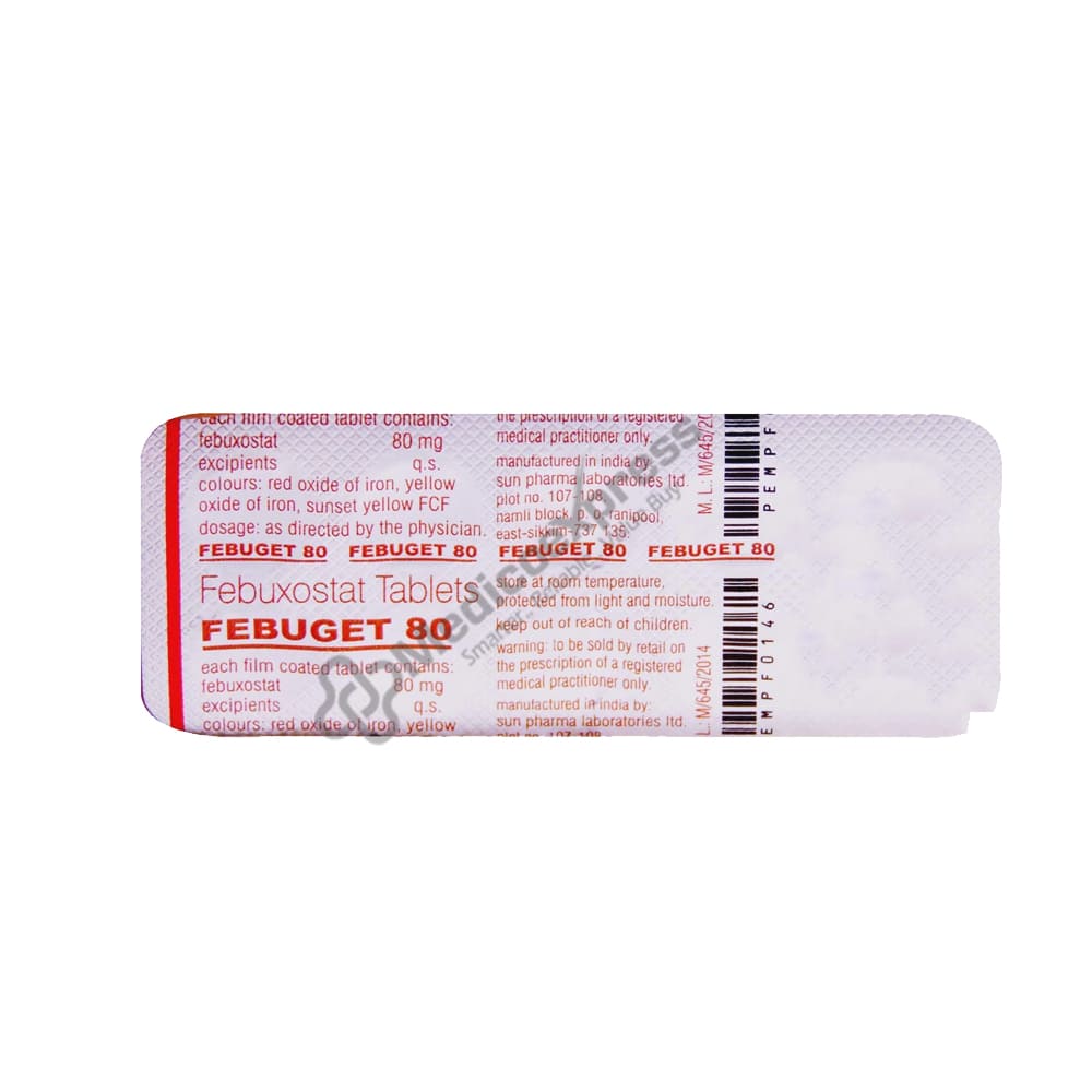 FEBUGET 80MG contains Febuxostat, a Xanthine oxidase (XO) inhibitor that is used to reduce blood uric acid levels in adults with gout. Gout is a type of arthritis in which uric acid, a naturally occurring substance in the body, accumulates in the joints, causing severe pain, redness, warmth, and swelling. This medication reduces uric acid levels. and prevents crystal formation, reducing symptoms over timeDisclaimer:For More Information Contact Your Physician