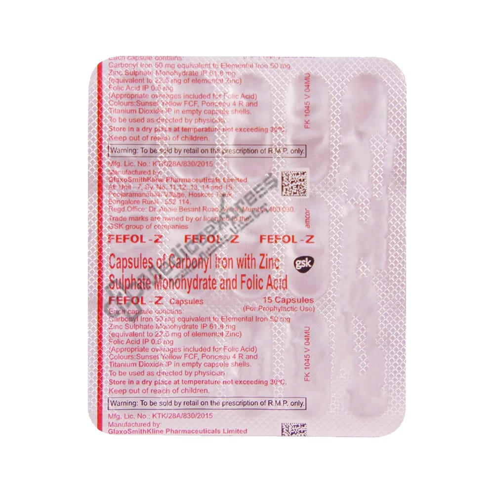 Fefol Z Capsule 15's Is a Combination Medication That Belongs To The 'Hematinic' Class Of Pharmaceuticals That Is Primarily Used To Prevent And Cure Low Levels Of Folic Acid, Zinc, And Iron In Blood During Certain Health Situations (e.g., Anaemia, Pregnancy, Low Diet, Surgery Recovery).Disclaimer:For More Information Contact Your Physician