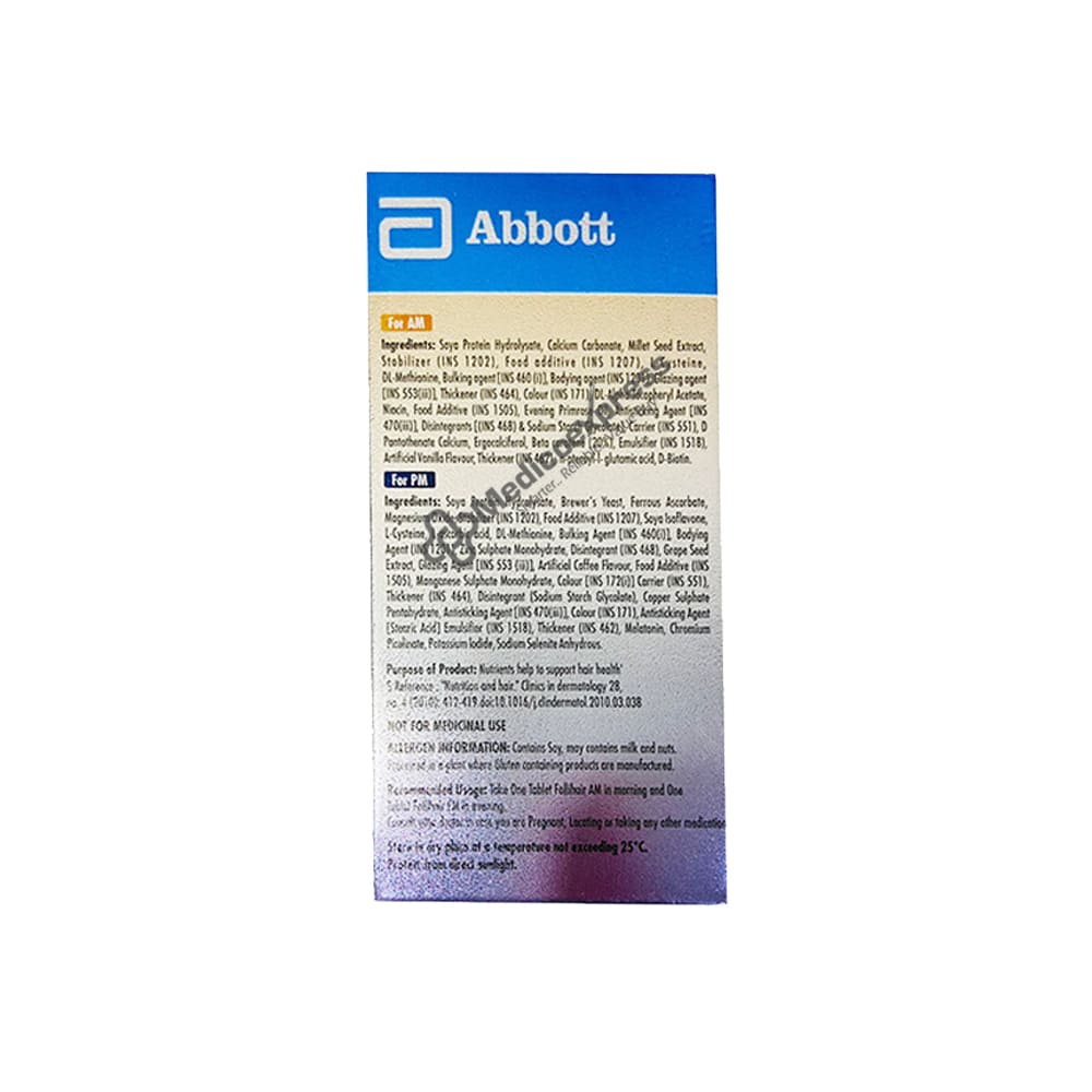 Follihair AMPM Tablet Gluten Free helps to prevent hair loss and promotes hair growth. It aids in the strengthening of the root shafts and the prevention of hair loss. It contains phytochemicals such as eclalbo saponins and wedelolactone, which aid in hair growth, root strengthening, and overall hair health. A natural hair tonic is an effective ingredient for hair and scalp management. It promotes hair growth by strengthening hair follicles.Disclaimer:For More Information Contact Your Physician