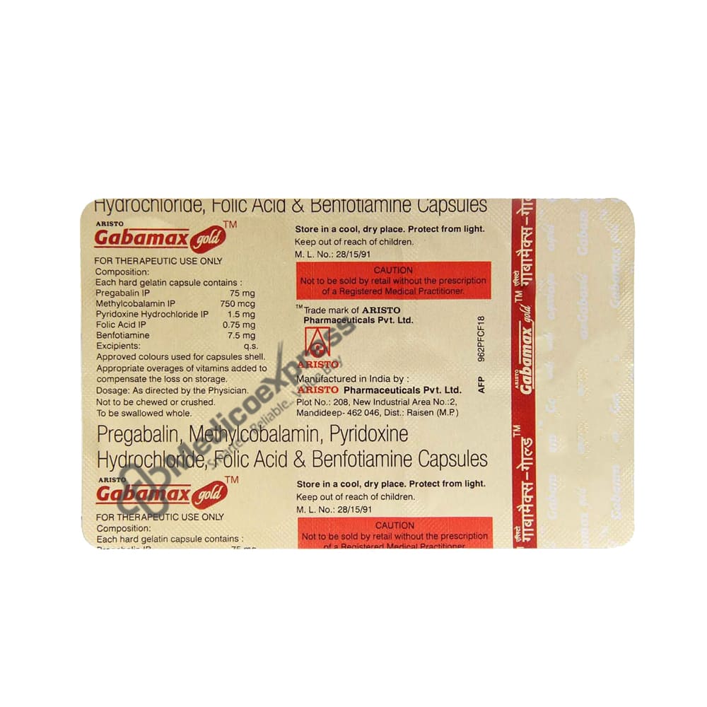 Gabamax Gold Capsule is a medication available only by prescription that reduces neuropathic pain (pain from damaged nerves). It bolsters the nervous system and eases nerve discomfort. You can consume food or not with Gabamax Gold Capsule. The dosage and time frame recommended by your doctor should be followed. It is recommended to take this medication at a set time. Never exceed the recommended dosage.Disclaimer : For More Details, Contact Your Physician
