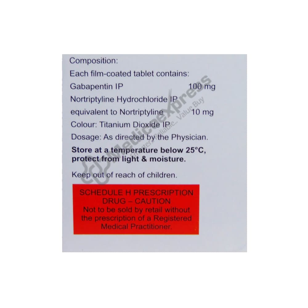 Gabaneuron NT-100 Tablet 10's is a combination medication used to treat neuropathic pain. It is a chronic, progressive nerve disease that causes pain in the nerves. Symptoms include unprovoked pain, an unpleasant sensation, shooting, burning, or stabbing pain, difficulty resting or sleeping, and evoked pain (pain caused by events that are usually not painful).It has Gabapentin and Nortriptyline in it. Gabapentin alleviates nerve pain by binding to a specific site on voltage-gated calcium channels. Nortriptyline prolongs the effect of serotonin and noradrenaline while also preventing pain signal movement in the brain.Disclaimer:For More Information Contact Your Physician